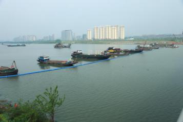 4月10日上午10點,13艘作業(yè)船分布在供水管道的各個吊點,開始進行注水沉管作業(yè)。為控制管道的水量流速,每注水一次10分鐘,暫停約15分鐘。施工方根據(jù)管道和每個吊點的受力情況,從南岸往北岸注水,船上每一個吊點根據(jù)水量調(diào)節(jié)逐漸下沉。由于河床差異,鋼管需要沉入水下十幾米,對施工技術要求很高,整個過程持續(xù)了六個小時。